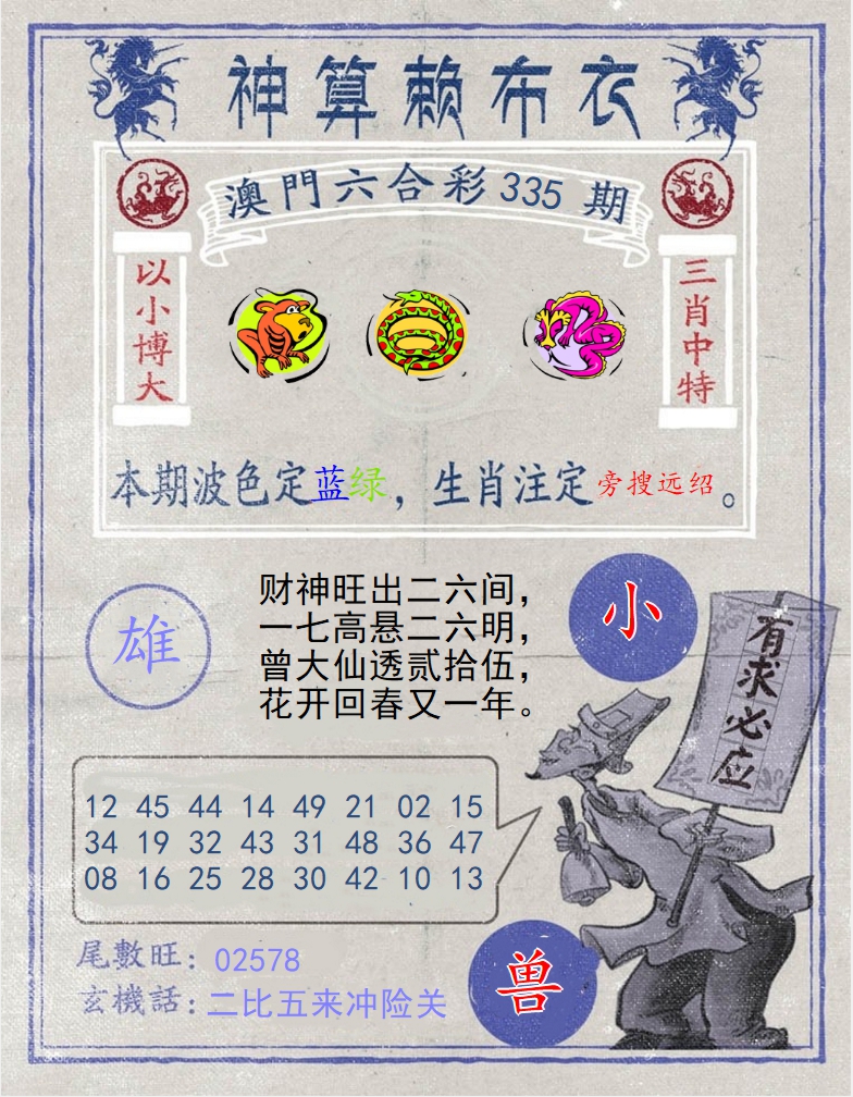 | 335期:财神旺出二六间,一七高悬二六明,曾大仙透贰拾伍,花开回春又一年 |