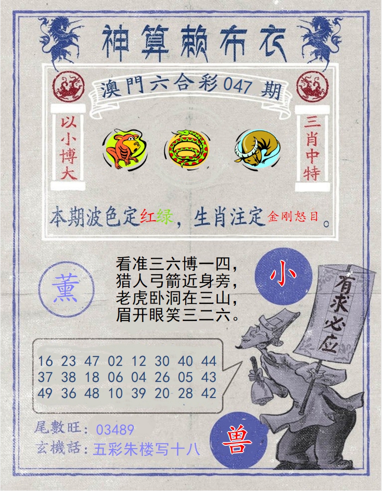 | 043期:三兄有势走幸运,开头结尾定有局,生肖今期定单蓝,单绿特码开本期 |